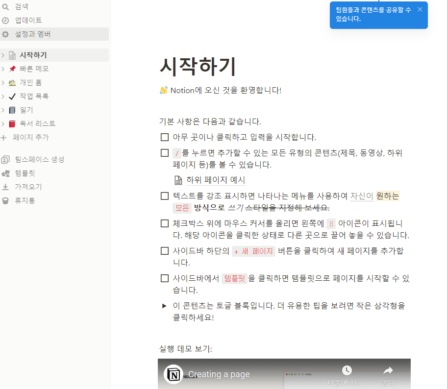 회원가입이 완료되면 노션의 첫 페이지가 이렇게 나오네요.