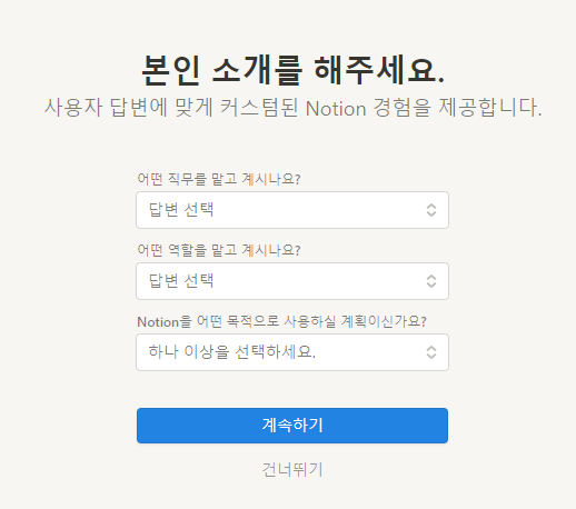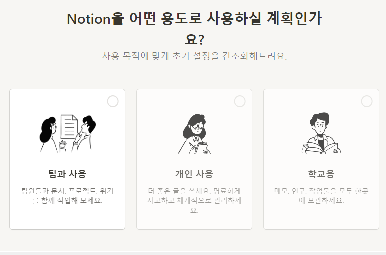 Notion을 어떤 용도로 사용하실 계획인가요? 는 초기설정 시 노션에서 제공하는 무료템플릿을 좀 더 용도에 맞게 제공받기 위해 설정하는 항목임으로 이후 사용에 영향을 미치지는 않으니 편하게 결정하시면 됩니다.