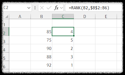 사용법: =RANK(값, 범위, [순서])