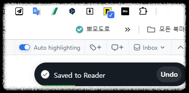 저장하고 싶은 웹 페이지에서 브라우저 상단의 리드와이즈 아이콘 노란 R을 클릭하면 아래와 같이 저장되었다고 뜬다.