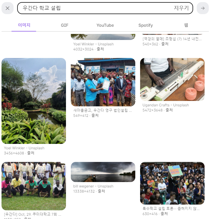 저는 제목으로 "우간다 학교 설립"을 적고 제목아래 이미지를 검색했습니다.