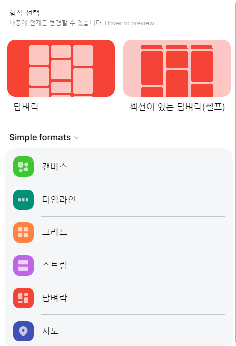 각 포맷에 마우스를 가져다 두면 형태를 바로 직관적으로 알 수 있습니다.