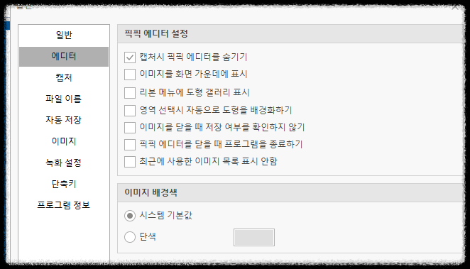 에디터 설정에서는 이미지 편집기의 동작을 설정할 수 있다. 편집 도구와 옵션을 세부적으로 조정하여 사용자의 편의에 맞게 설정할 수 있다. 개인적으로 에디터설정에선 캡처시 픽픽 에디터를 숨기기만 체크한다.