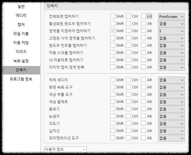 단축키 설정에서는 다양한 캡처 기능을 위한 단축키를 설정할 수 있다. 기본 캡처 단축키와 특수 캡처 단축키를 사용자 맞춤형으로 지정할 수 있다.