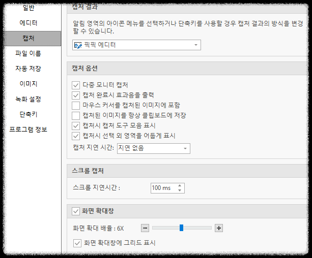 캡처 설정에서는 스크린샷을 찍을 때의 동작을 세부적으로 조정할 수 있다. 다중 모니터 캡처, 캡처 완료시 효과음 출력, 마우스 커서를 캡처된 이미지에 포함, 캡처된 이미지를 항상 클립보드에 저장, 캡처 후 이미지 미리 보기, 캡처 시 선택 영역의 여백을 어둡게 표시 등을 설정할 수 있다.