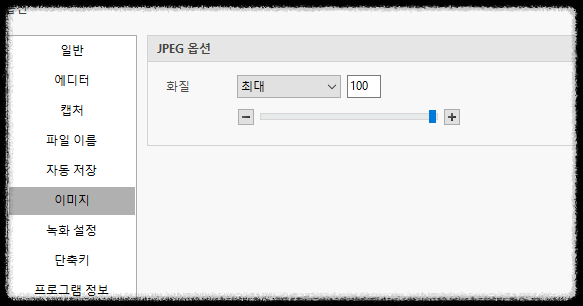 이미지 설정에서는 캡처한 이미지를 jpeg 파일의 화질을 설정할 수 있다.